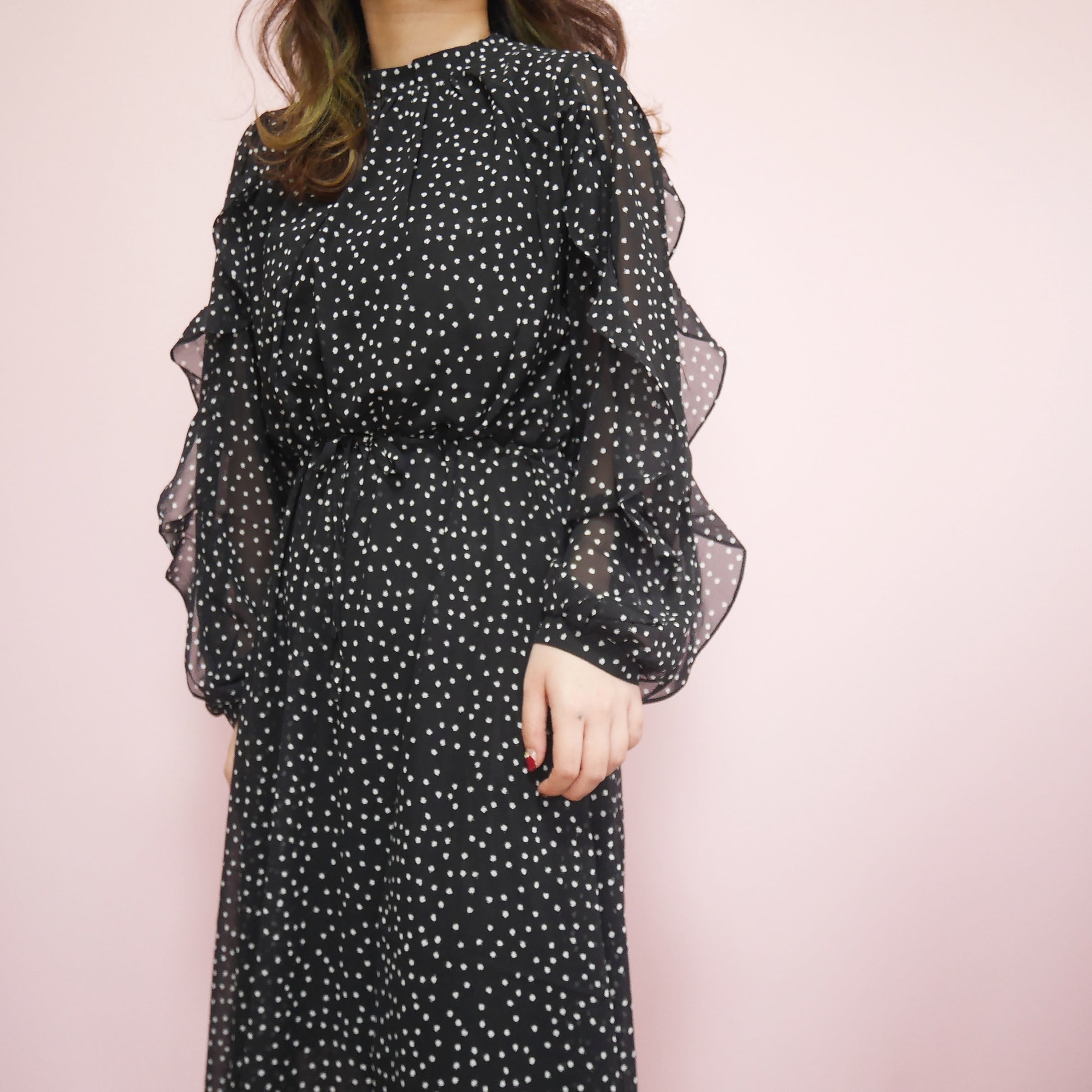 袖に施されたフリルが上品でかわいいロングワンピースです。
